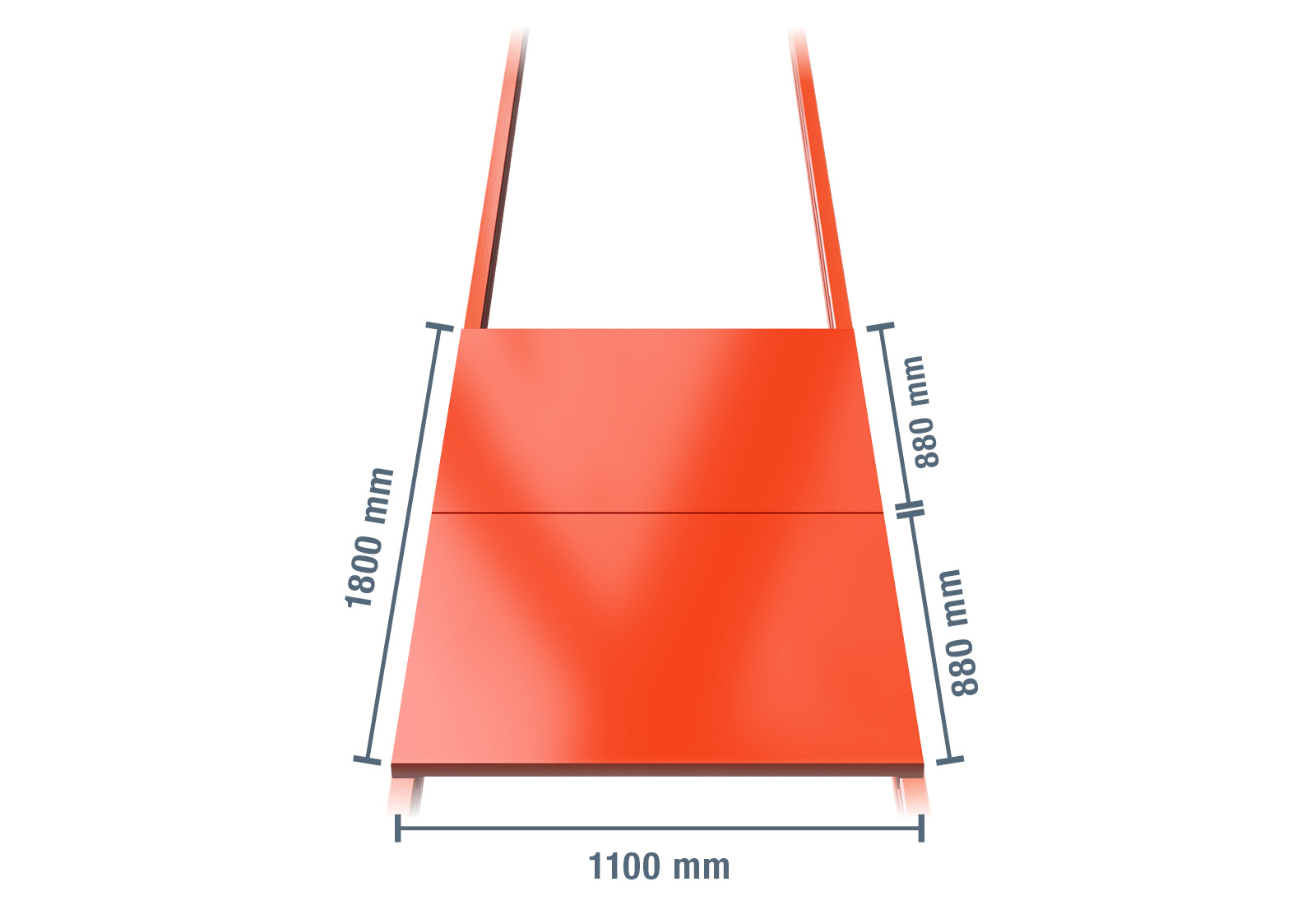 A prateleira de aço para as estantes para paletes é composta por 2 módulos, com uma profundidade de 1.100 mm e uma largura de 885 mm. Isto dá-lhe uma dimensão de largura total de 1.800 mm. Cada módulo pode suportar uma carga máxima de 1.000 kg.