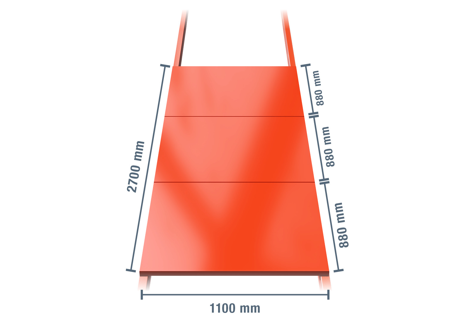 A prateleira de aço para as estantes para paletes é composta por 3 módulos, com uma profundidade de 1.100 mm e uma largura de 885 mm. Isto dá-lhe uma dimensão de largura total de 2.700 mm. Cada módulo pode suportar uma carga máxima de 1.000 kg.