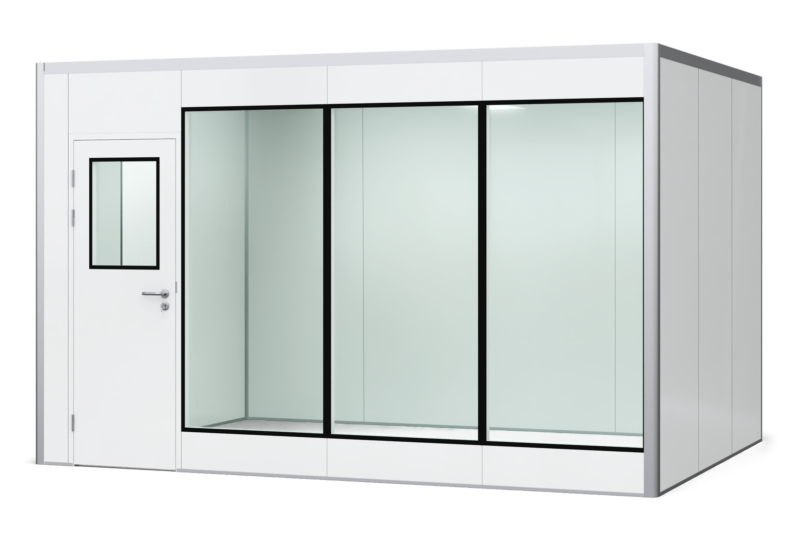 A altura (2,50 m dimensão interna | 2,55 m dimensão externa) e a profundidade da sala (3 m dimensão interna | 3,10 m dimensão externa) permanecem sempre as mesmas. O material dos painéis, construído em construção sanduíche, consiste em aço (branco, pintado por spray, 0,4 mm de aço) no exterior e no interior e lã de rocha como uma camada isolante no meio. Isto significa que os painéis não são exactamente leves (11 kg/sqm) mas muito estáveis e que pouco ruído do ambiente frequentemente ruidoso da sala penetra no sistema room-in-room. O valor de isolamento situa-se entre 20 - 40 dB, dependendo do nível de ruído exterior. O valor de isolamento térmico dos escritórios do salão PREFAB é 0,787 W/(m²K) e a condutividade térmica 0,05 W/(mK).