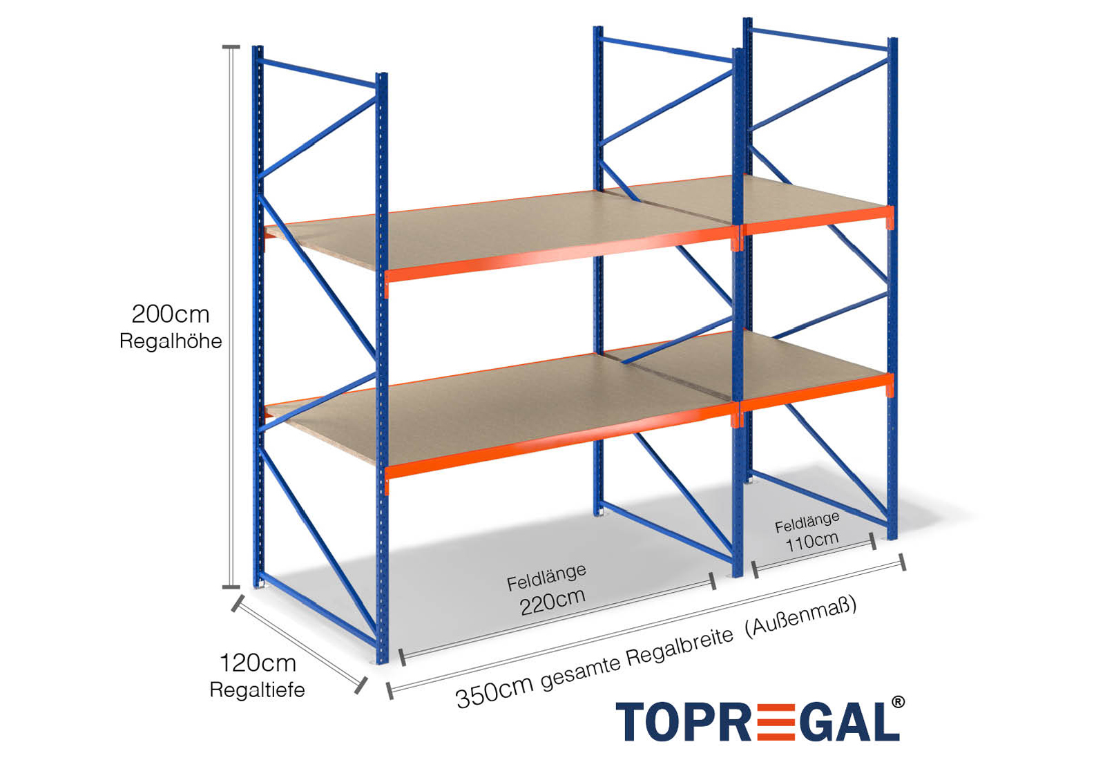 3,5 m estante de armazenamento LR2000 / 120 cm profundidade / 2 m altura / 2 níveis / prateleiras de madeira