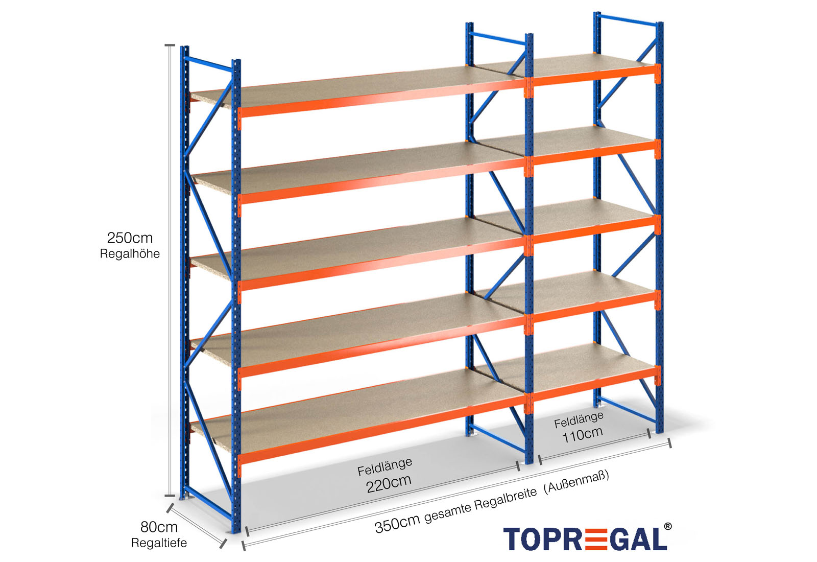 Esta estante de armazenamento impressiona pela sua altura de 2,5 m, profundidade de 80 cm e largura de 3,5 m. Cada um dos 5 níveis proporciona uma carga máxima de 500 kg, em que a carga máxima entre duas estruturas (a carga por unidade) de 2.000 kg não deve ser excedida. Estas especificações referem-se sempre a uma carga distribuída uniformemente nas estantes. A montagem é fácil rápida, graças ao sistema de encaixe. Existe também uma extensa gama de peças individuais e acessórios para estantes largas da TOPREGAL, tais como estruturas de estantes, travessas, bandas magnéticas e caixas de armazenamento à vista.