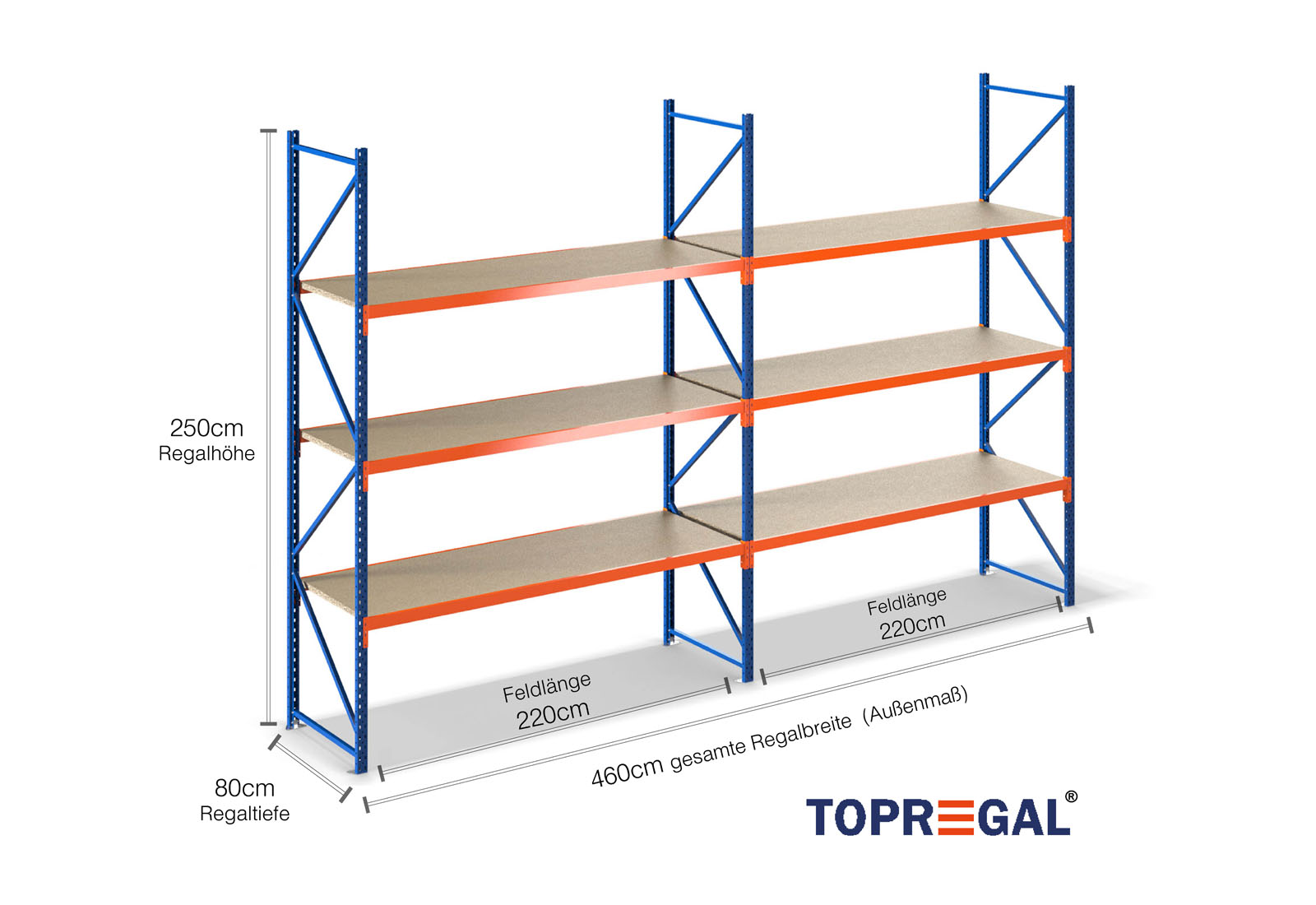 Esta estante de armazenamento impressiona pela sua altura de 2,5 m, profundidade de 80 cm e largura de 4,6 m. Cada um dos 3 níveis proporciona uma carga máxima de 500 kg, em que a carga máxima entre duas estruturas (a carga por unidade) de 2.000 kg não deve ser excedida. Estas especificações referem-se sempre a uma carga distribuída uniformemente nas estantes. A montagem é fácil rápida, graças ao sistema de encaixe. Existe também uma extensa gama de peças individuais e acessórios para estantes largas da TOPREGAL, tais como estruturas de estantes, travessas, bandas magnéticas e caixas de armazenamento à vista.