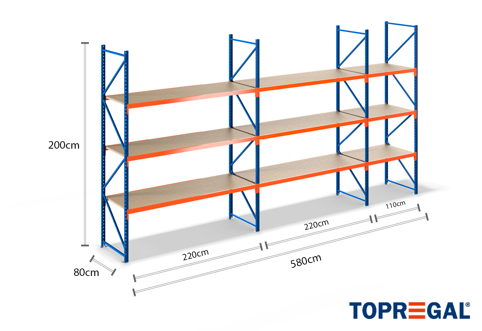 5,8 m estante de armazenamento LR2000 / 80 cm profundidade / 2 m altura / 3 níveis / prateleiras de madeira