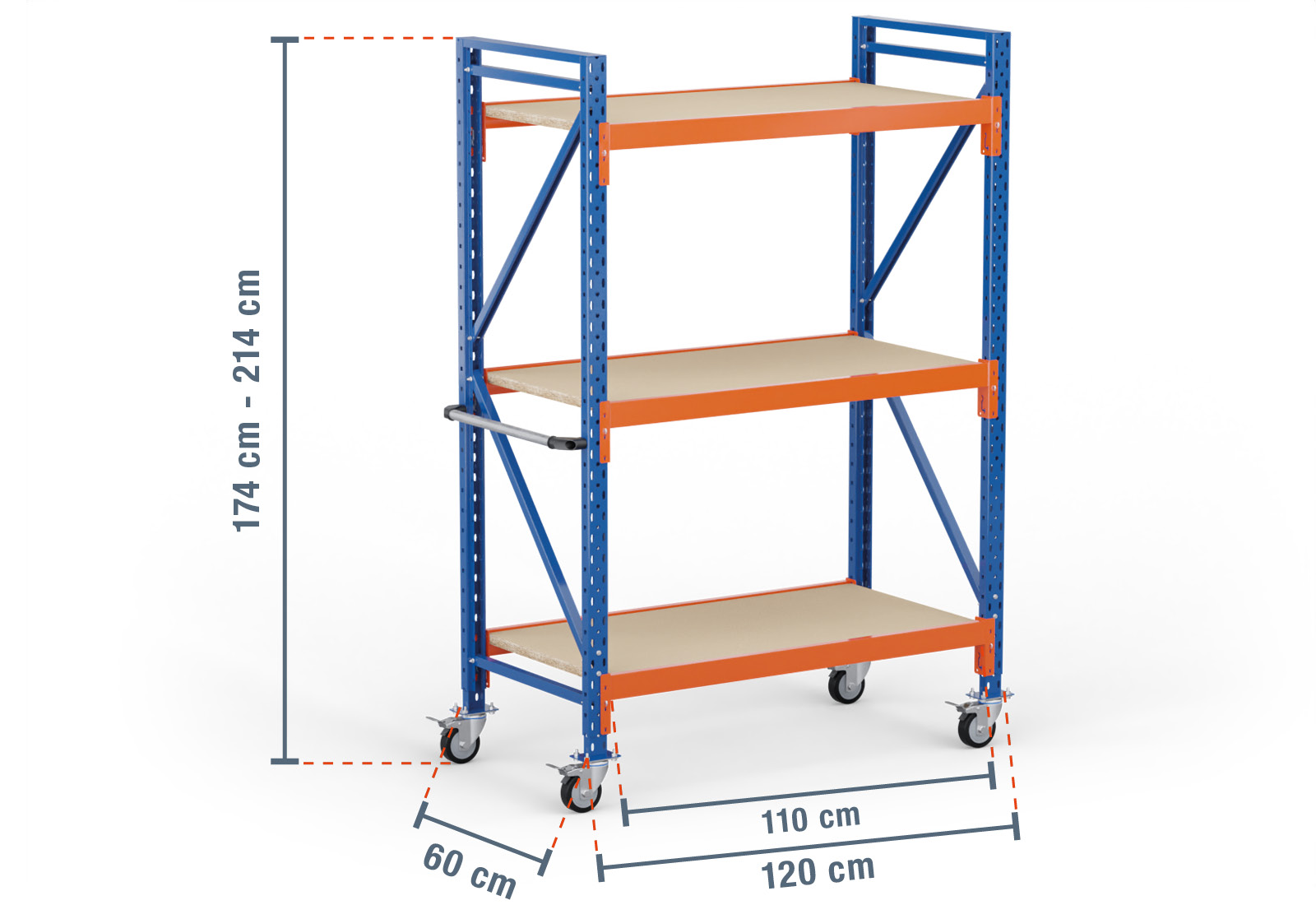1,2 m estante móvel de armazenamento LR2000 / 60 cm profundidade / 1.740 - 2.140 mm altura / 3 níveis / prateleiras de madeira