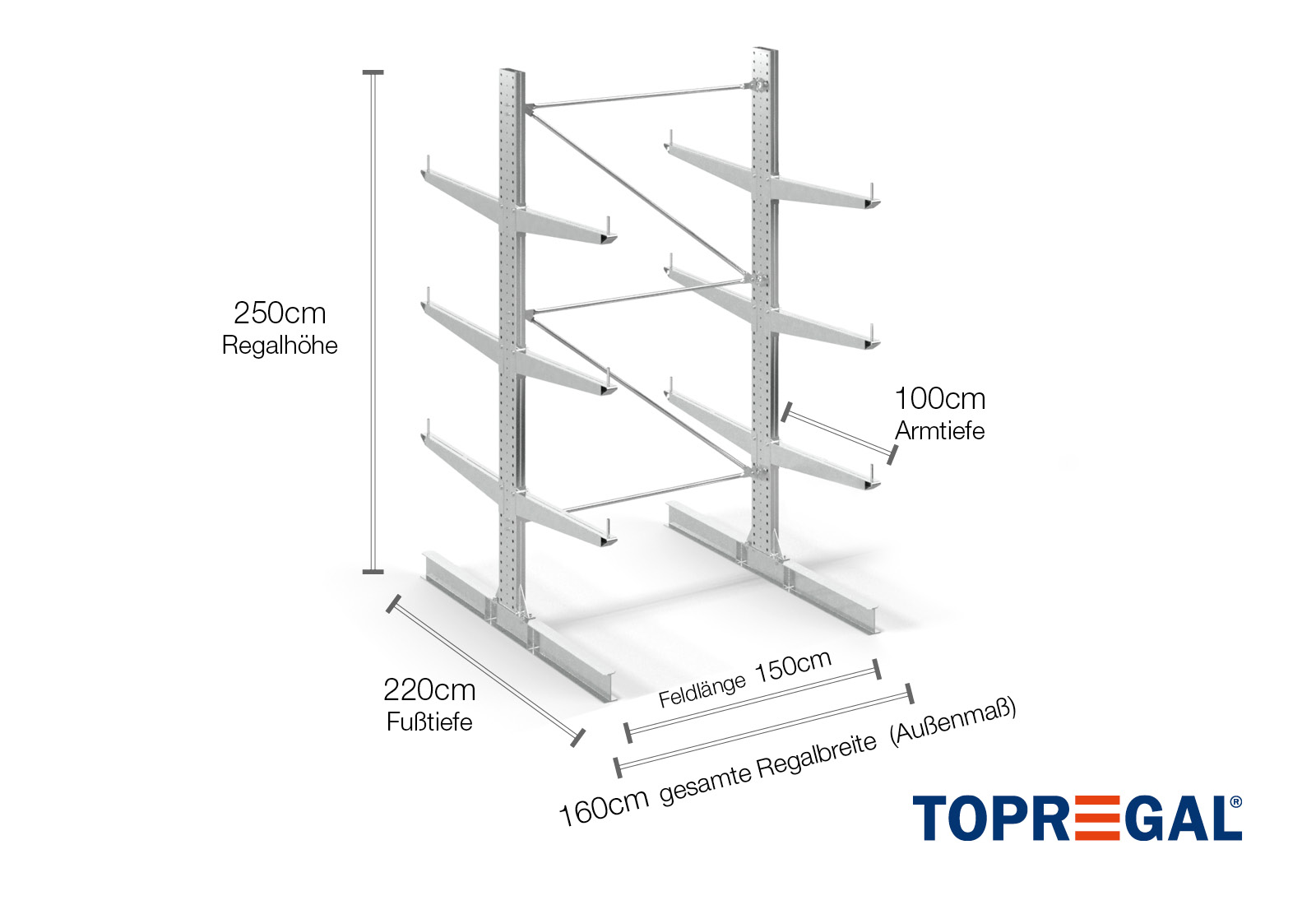 Esta estante cantilever bilateral tem uma largura de 1,6 m, uma altura de 2,5 m, uma profundidade total de 220 cm e possui mais de 3 níveis de braços cantilever, com uma profundidade dos braços de 100 cm. A carga máxima por braço neste caso é de 500 kg. Os braços cantilever podem ser colocados individualmente numa dimensão de grelha de 50 mm e protegidos através de cavilhas e pinos de segurança. As bases também podem ser utilizadas como nível de armazenamento (dependendo da mercadoria). Para proteger a carga contra deslizes acidentais, pode ser inserida uma proteção antideslizante na extremidade de cada braço cantilever. Isto está, por padrão, incluído na entrega.