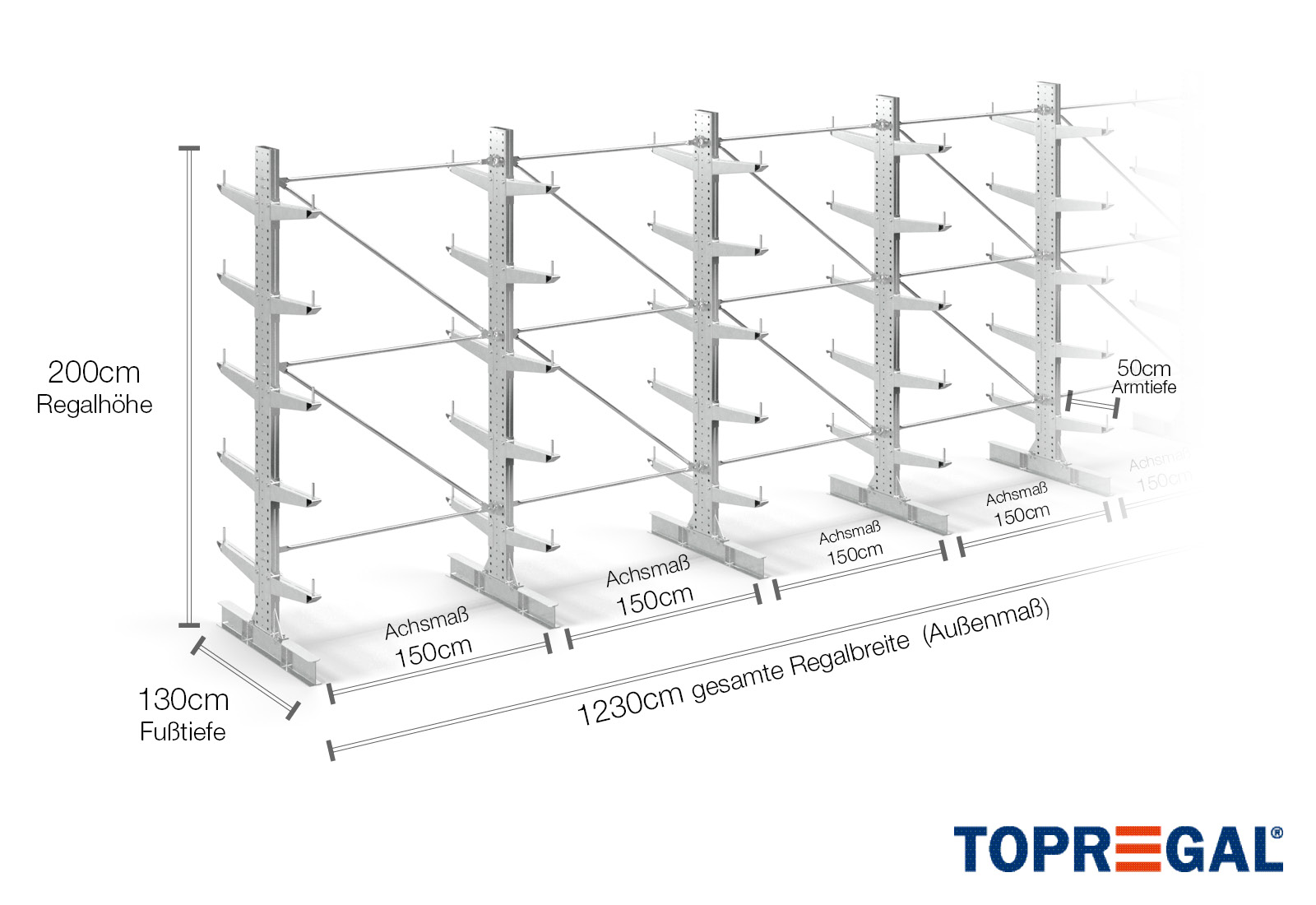 Esta estante cantilever bilateral tem uma largura de 12,3 m, uma altura de 2 m, uma profundidade total de 120 cm e possui mais de 5 níveis de braços cantilever, com uma profundidade dos braços de 50 cm. A carga máxima por braço neste caso é de 500 kg. Os braços cantilever podem ser colocados individualmente numa dimensão de grelha de 50 mm e protegidos através de cavilhas e pinos de segurança. As bases também podem ser utilizadas como nível de armazenamento (dependendo da mercadoria). Para proteger a carga contra deslizes acidentais, pode ser inserida uma proteção antideslizante na extremidade de cada braço cantilever. Isto está, por padrão, incluído na entrega.