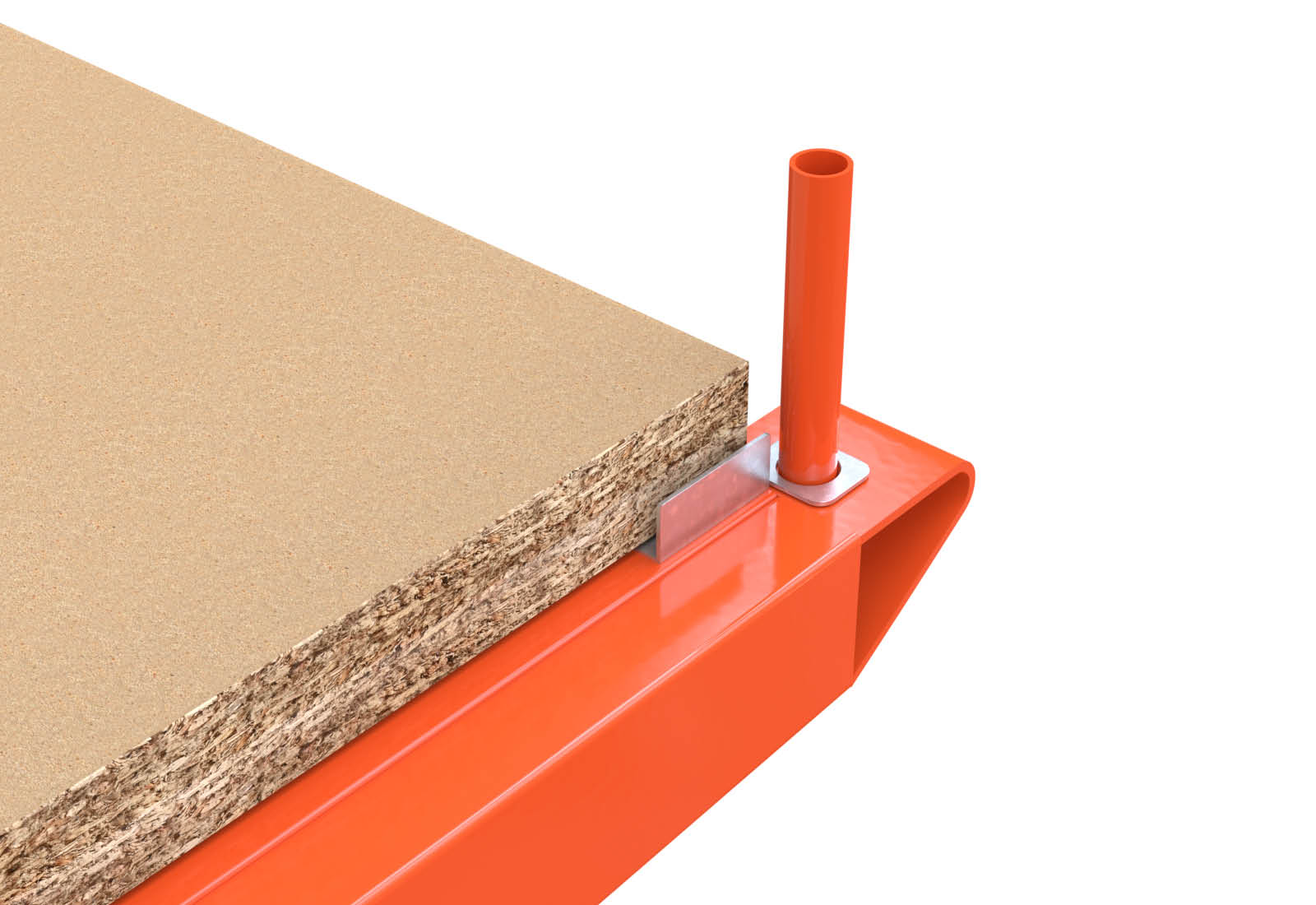 Com os suportes da estante integrados feitos de placas de aglomerado de 38 mm espessura, pode utilizar as suas estantes cantilever da TOPREGAL de forma ainda mais flexível e criar facilmente espaço de armazenamento adicional. O suporte de madeira é fixado na parte frontal e na traseira com duas barras de fixação incluídas na entrega. Com as barras de fixação, a capacidade de carga do suporte da estante é de até 400 kg.