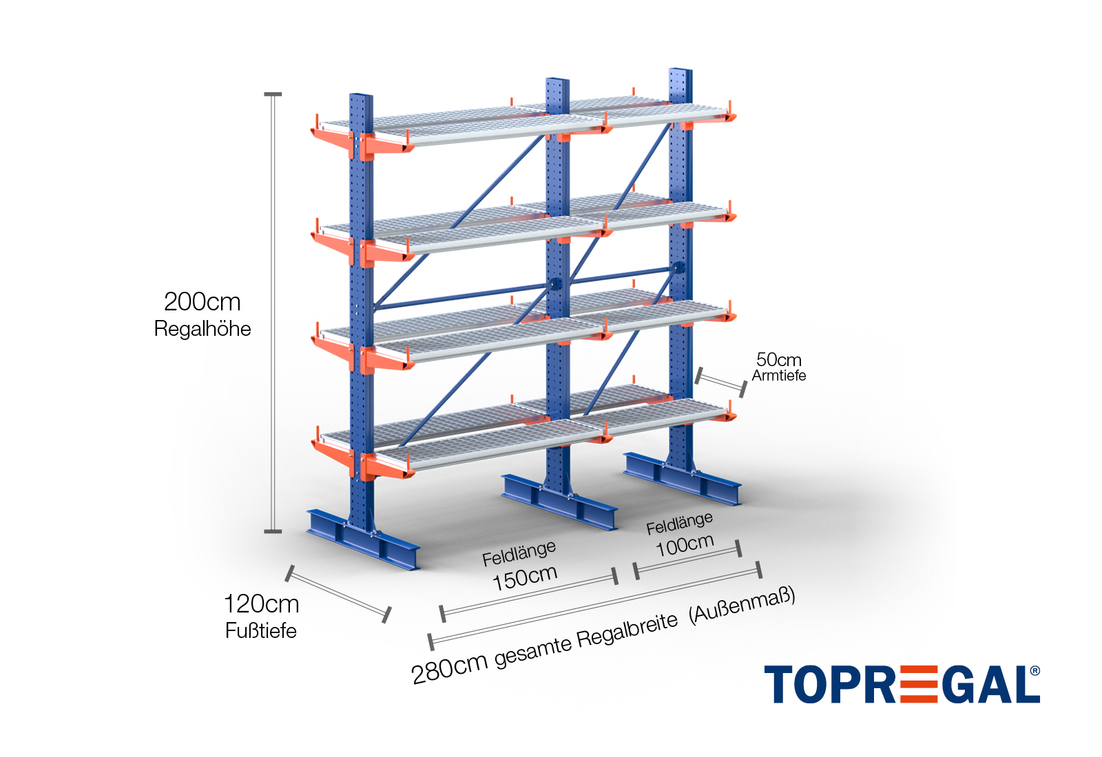 Esta estante cantilever bilateral tem uma largura de 2,8 m, uma altura de 2 m, uma profundidade total de 120 cm e possui mais de 4 níveis de braços cantilever, com uma profundidade dos braços de 50 cm. A carga máxima por braço neste caso é de 500 kg. Os braços cantilever podem ser colocados individualmente numa dimensão de grelha de 50 mm e protegidos através de cavilhas e pinos de segurança. As bases também podem ser utilizadas como nível de armazenamento (dependendo da mercadoria). Para proteger a carga contra deslizes acidentais, pode ser inserida uma proteção antideslizante na extremidade de cada braço cantilever. Isto está, por padrão, incluído na entrega.