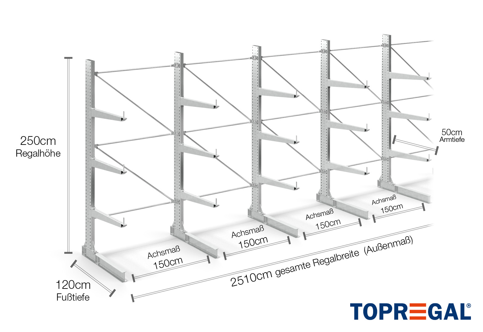 Esta estante cantilever unilateral tem uma largura de 25,1 m, uma altura de 2,5 m, uma profundidade total de 130 cm e possui mais de 3 níveis de braços cantilever, com uma profundidade dos braços de 100 cm. A carga máxima por braço neste caso é de 500 kg. Os braços cantilever podem ser colocados individualmente numa dimensão de grelha de 50 mm e protegidos através de cavilhas e pinos de segurança. As bases também podem ser utilizadas como nível de armazenamento (dependendo da mercadoria). Para proteger a carga contra deslizes acidentais, pode ser inserida uma proteção antideslizante na extremidade de cada braço cantilever. Isto está, por padrão, incluído na entrega.