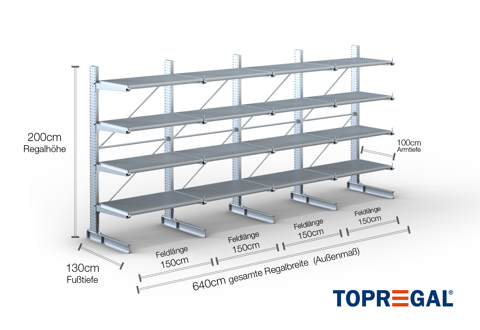 Esta estante cantilever unilateral tem uma largura de 6,4 m, uma altura de 2 m, uma profundidade total de 130 cm e possui mais de 4 níveis de braços cantilever, com uma profundidade dos braços de 100 cm. A carga máxima por braço neste caso é de 500 kg. Os braços cantilever podem ser colocados individualmente numa dimensão de grelha de 50 mm e protegidos através de cavilhas e pinos de segurança. As bases também podem ser utilizadas como nível de armazenamento (dependendo da mercadoria). Para proteger a carga contra deslizes acidentais, pode ser inserida uma proteção antideslizante na extremidade de cada braço cantilever. Isto está, por padrão, incluído na entrega.