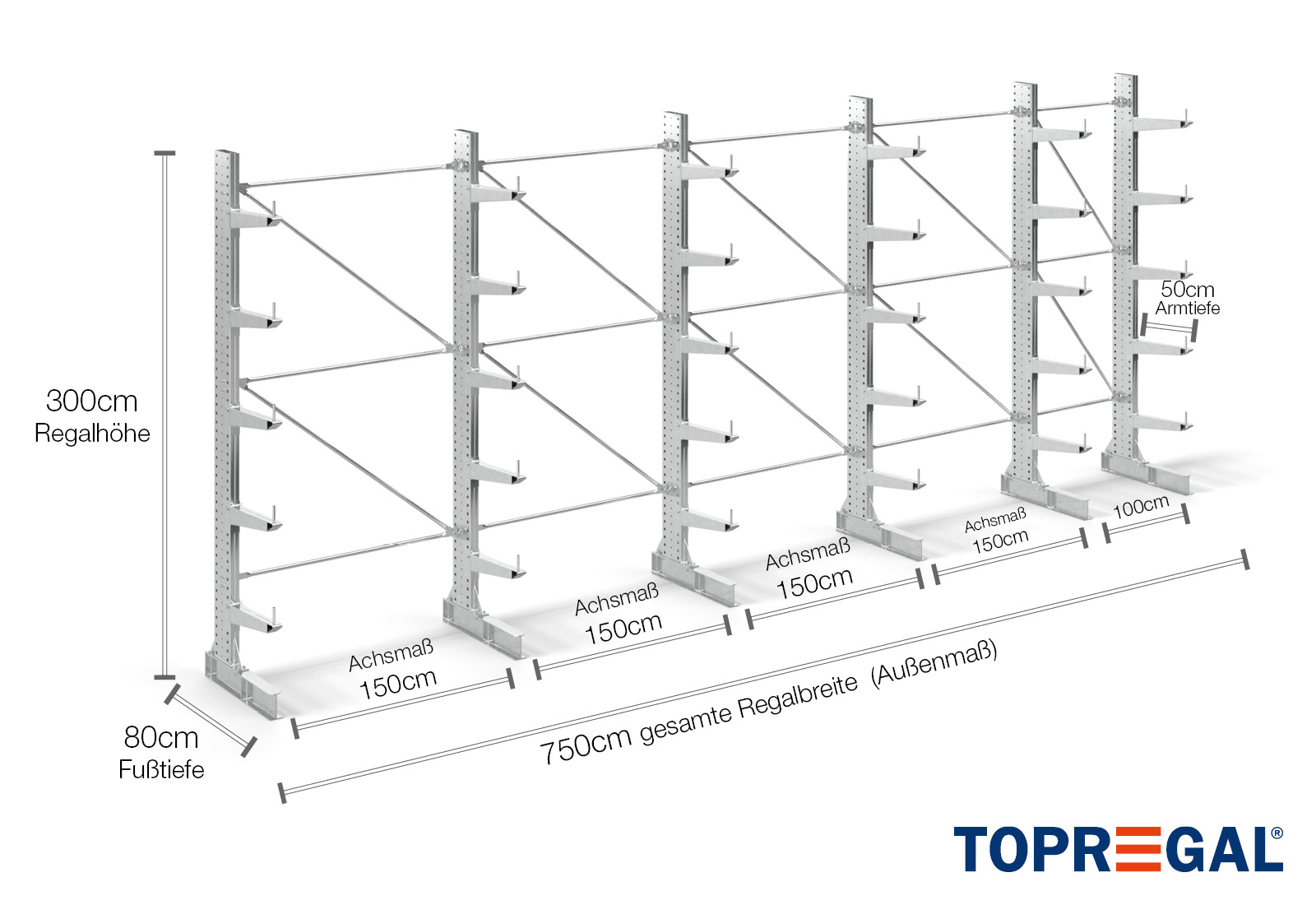 Esta estante cantilever unilateral tem uma largura de 7,5 m, uma altura de 3 m, uma profundidade total de 80 cm e possui mais de 5 níveis de braços cantilever, com uma profundidade dos braços de 50 cm. A carga máxima por braço neste caso é de 500 kg. Os braços cantilever podem ser colocados individualmente numa dimensão de grelha de 50 mm e protegidos através de cavilhas e pinos de segurança. As bases também podem ser utilizadas como nível de armazenamento (dependendo da mercadoria). Para proteger a carga contra deslizes acidentais, pode ser inserida uma proteção antideslizante na extremidade de cada braço cantilever. Isto está, por padrão, incluído na entrega.
