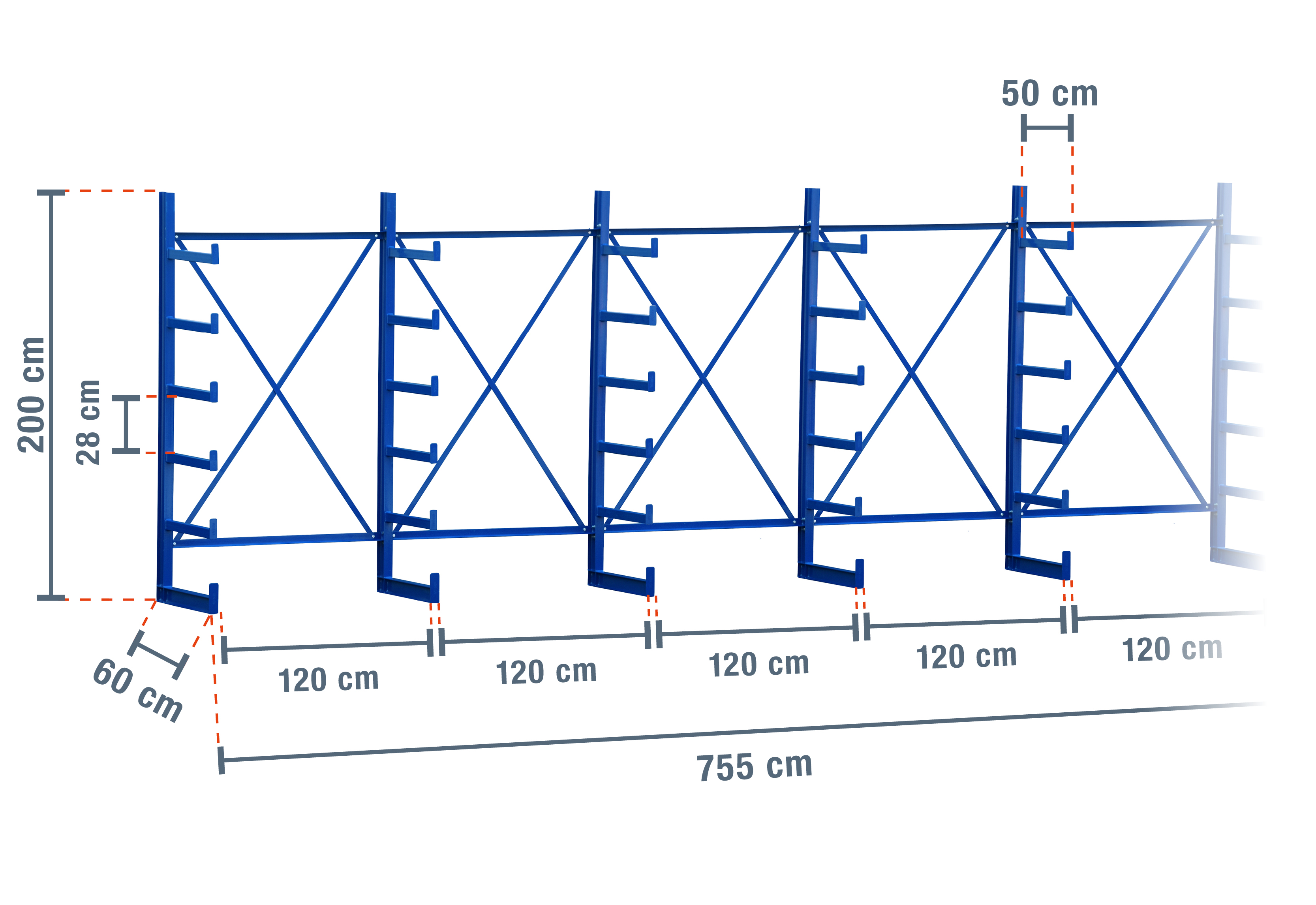 Esta estante cantilever particularmente robusta com uma largura de 7,55 m tem 2 m de altura e 5 níveis, com uma profundidade dos braços de 50 cm. Graças ao modelo unilateral com braços cantilever já soldados, é possível carregar cada braço com um máximo de 1.250 kg, sendo que cada braço tem uma carga máxima de 250 kg.