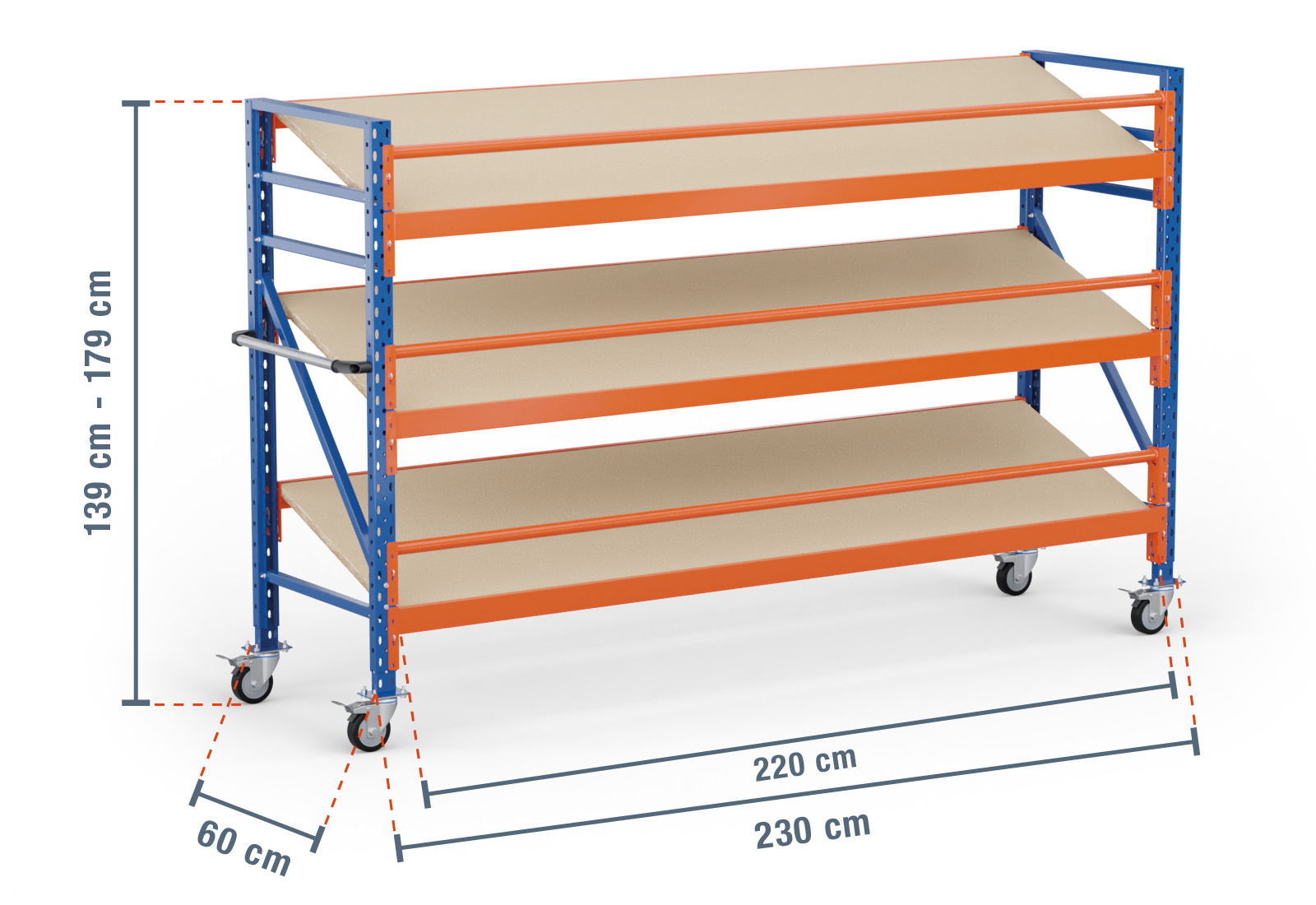 A altura total da estante móvel inclinada pode ser ajustada em 40 cm, entre 1.390 - 1.790 mm. Para isso, apenas a altura de inserção do suporte na base é ajustada. Isto permite-lhe regular a sua estante à altura ideal para a sua utilização. Graças ao princípio modular das nossas estantes de armazenamento, este tipo de prateleiras também pode ser flexivelmente expandido e adaptado.