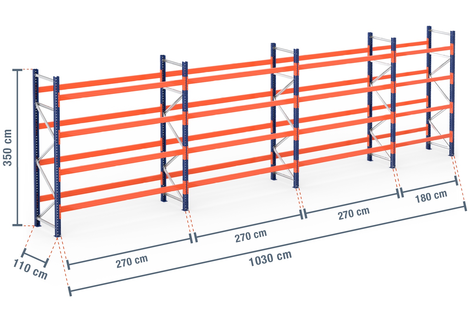 10,3 m estante para paletes PR9000 / 110 cm profundidade / 3,5 m altura / 4 níveis para 55 europaletes