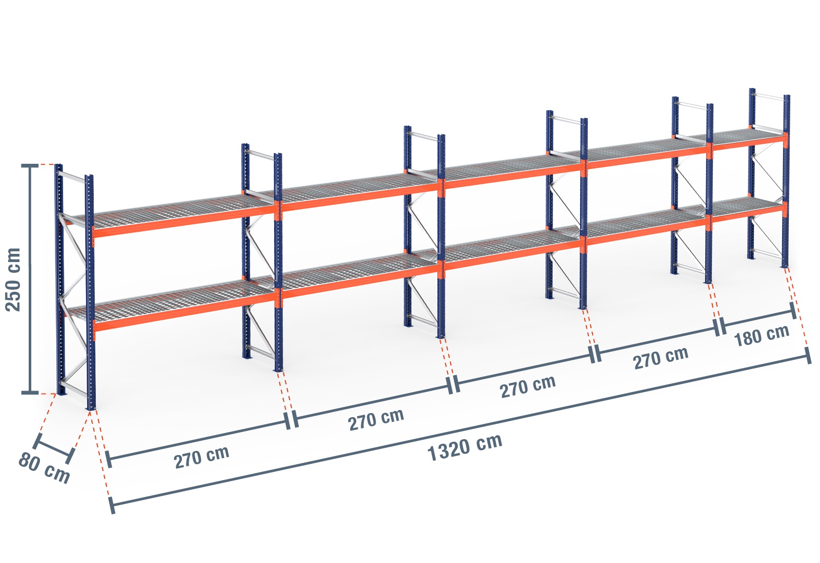 13,2 m estante para paletes PR9000 / 80 cm profundidade / 2,5 m altura / 2 níveis / prateleiras de grade