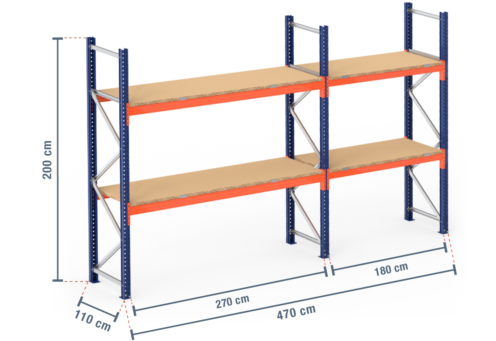 4,7 m estante para paletes PR9000 / 110 cm profundidade / 2 m altura / 2 níveis / prateleiras de madeira