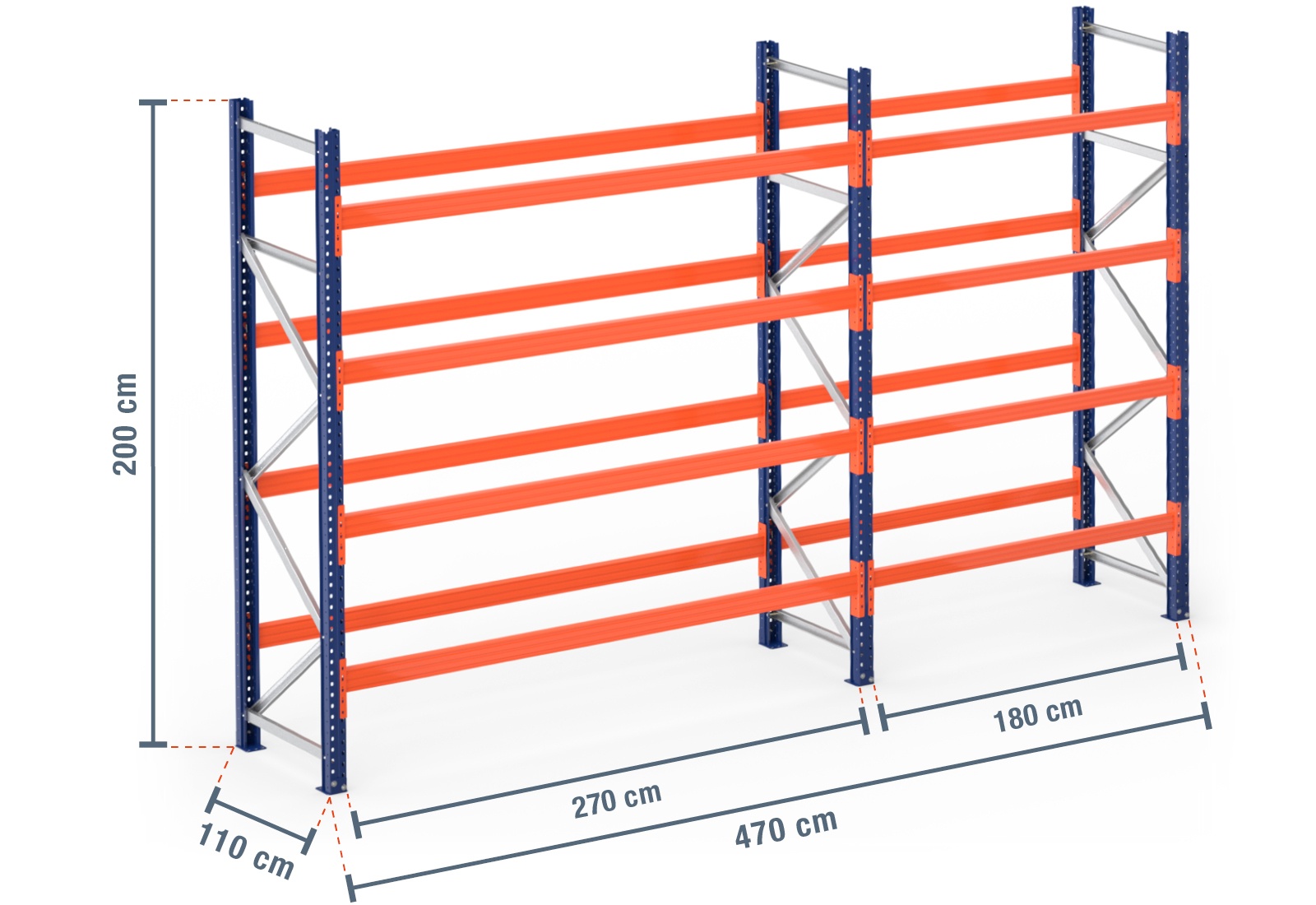 As travessas são revestidas a pó em laranja berrante, de forma a garantir segurança na área de trabalho. Encaixam-se facilmente na estrutura da estante. Cavilhas de segurança adicionais protegem a travessa contra deslocamento acidental e garantem assim a segurança. As estruturas das estantes para paletes são compostas por dois perfis estruturais revestidos a pó em azul. Os perfis estruturais frontais e traseiros são aparafusados um ao outro com auxílio dos tirantes transversais e diagonais e permitem uma estabilidade particularmente alta. Por segurança, são adicionalmente montadas na estrutura 2 placas de apoio por estrutura da estante na extremidade inferior e fixadas ao solo com âncoras de fixação ao solo. Isto torna a nossa estante para paletes modular não só personalizável, mas também particularmente segura através da fixação à superfície.