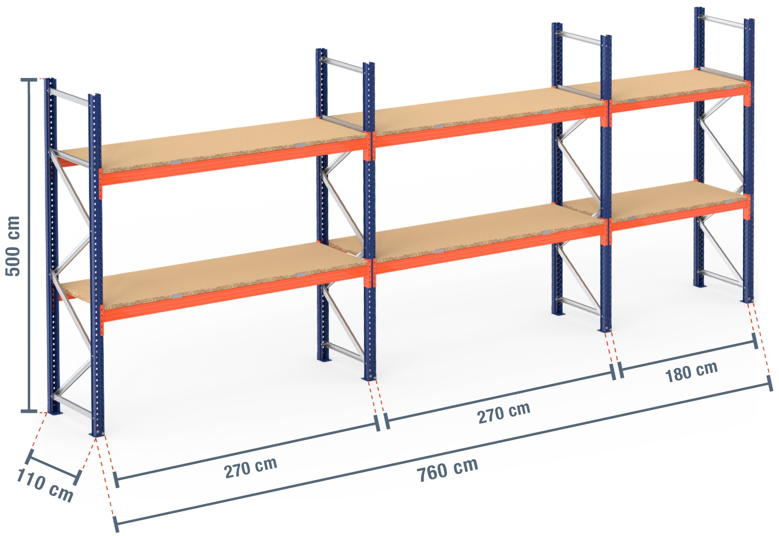 7,6 m estante para paletes PR9000 / 110 cm profundidade / 5 m altura / 2 níveis / prateleiras de madeira