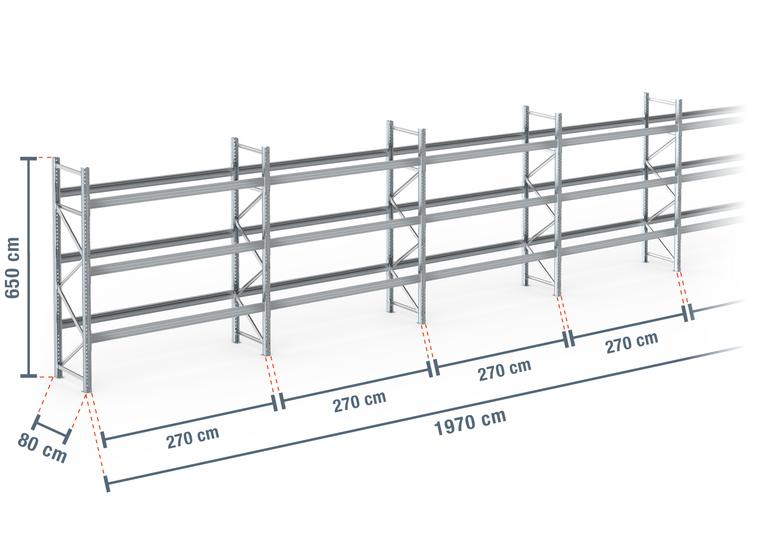 PR9000F estante para paletes 19,7 m galvanizada a quente / 80 cm de profundidade / 6,5 m de altura / 3 níveis para 84 europaletes