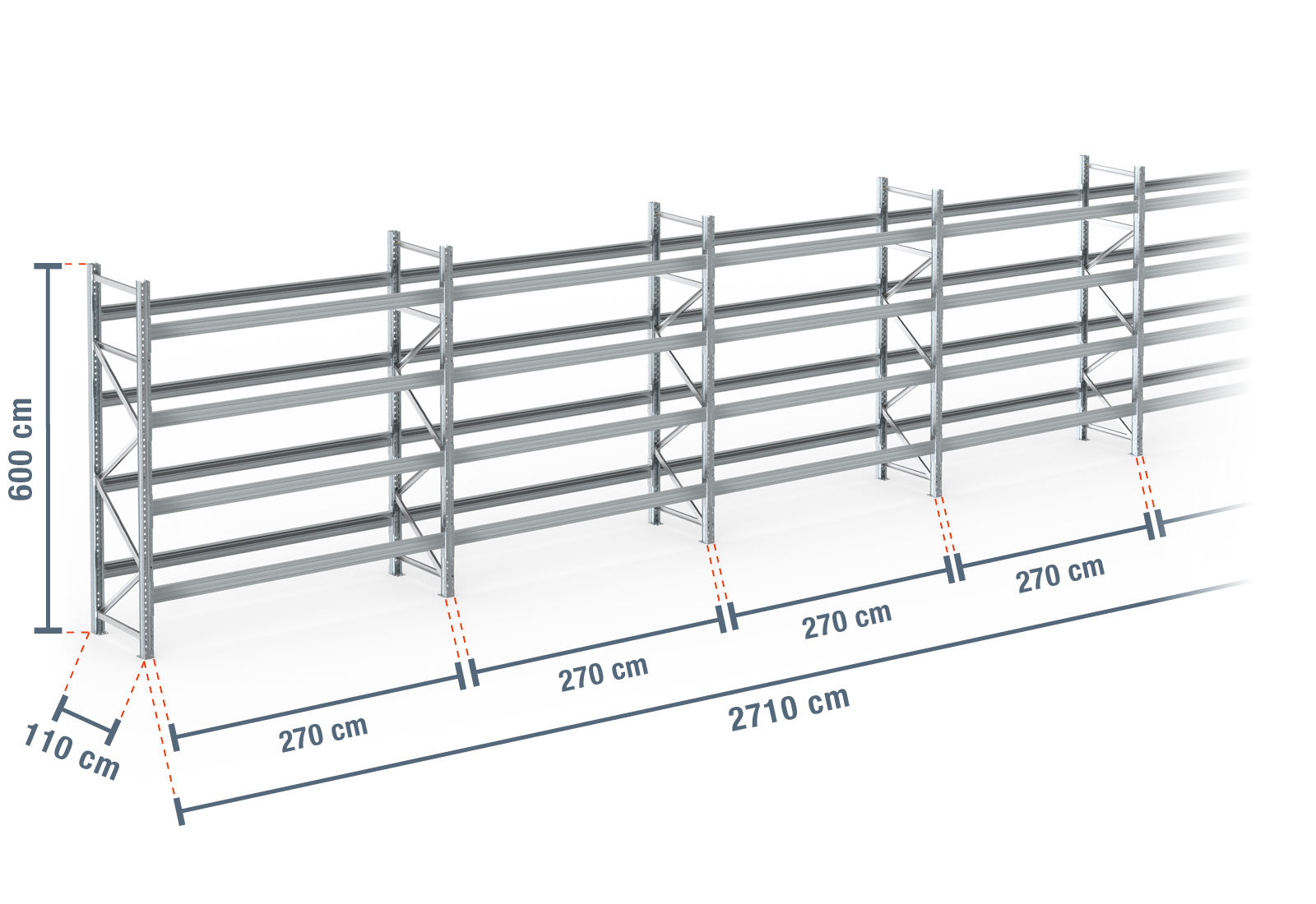 - 11 x estruturas PR9000F, 6 m de altura/110 cm de profundidade incluindo haste de reforço, carga por unidade: 9.000 kg