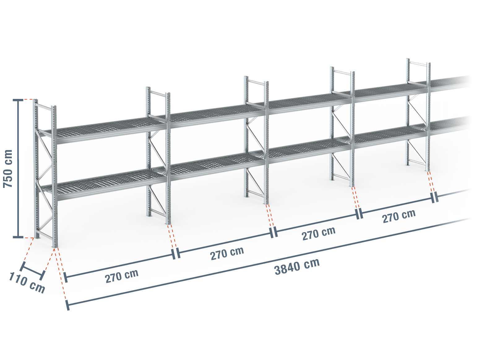 PR9000F estante para paletes 38,4 m galvanizada a quente / 110 cm profundidade / 7,5 m altura / 2 níveis / prateleiras de grade