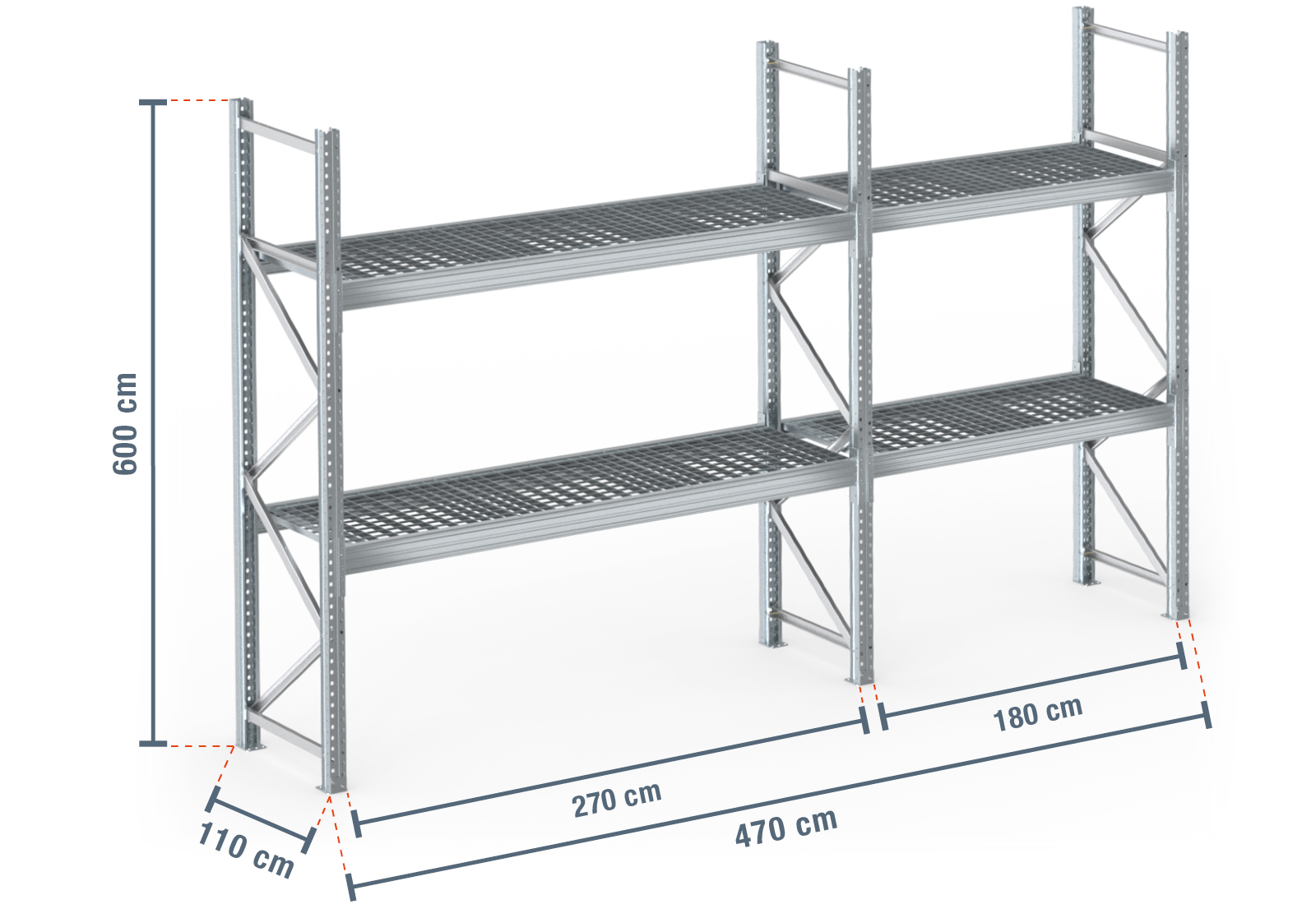PR9000F estante para paletes 4,7 m galvanizada a quente / 110 cm profundidade / 6 m altura / 2 níveis / prateleiras de grade
