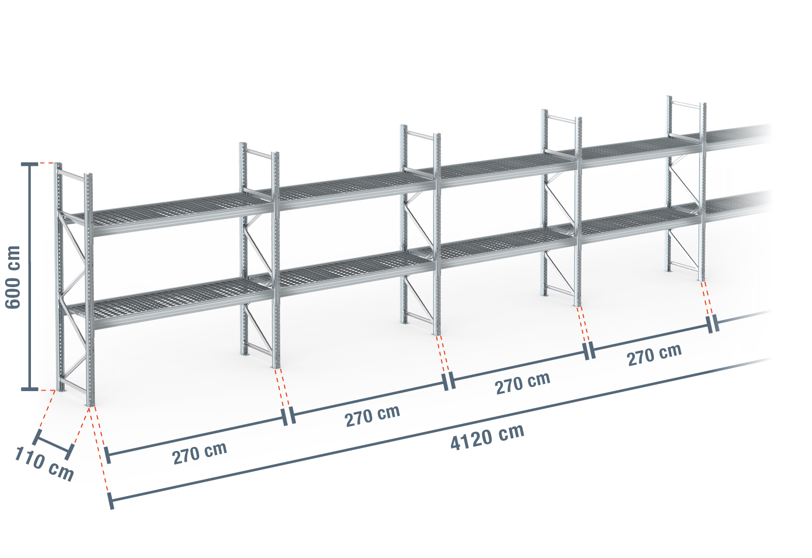 PR9000F estante para paletes 41,2 m galvanizada a quente / 110 cm profundidade / 6 m altura / 2 níveis / prateleiras de grade