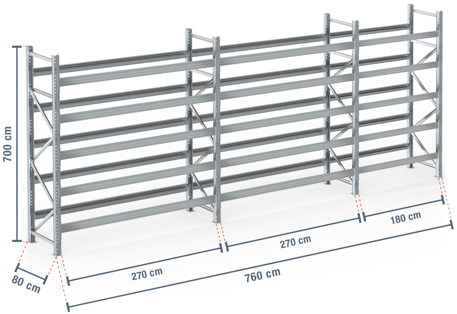 Nós oferecemos as alturas comuns de 200 cm a 750 cm em passos de 50 cm. Para alturas individuais, os montantes da prateleira são cortados à medida a pedido ou fabricados individualmente de acordo com as suas necessidades.