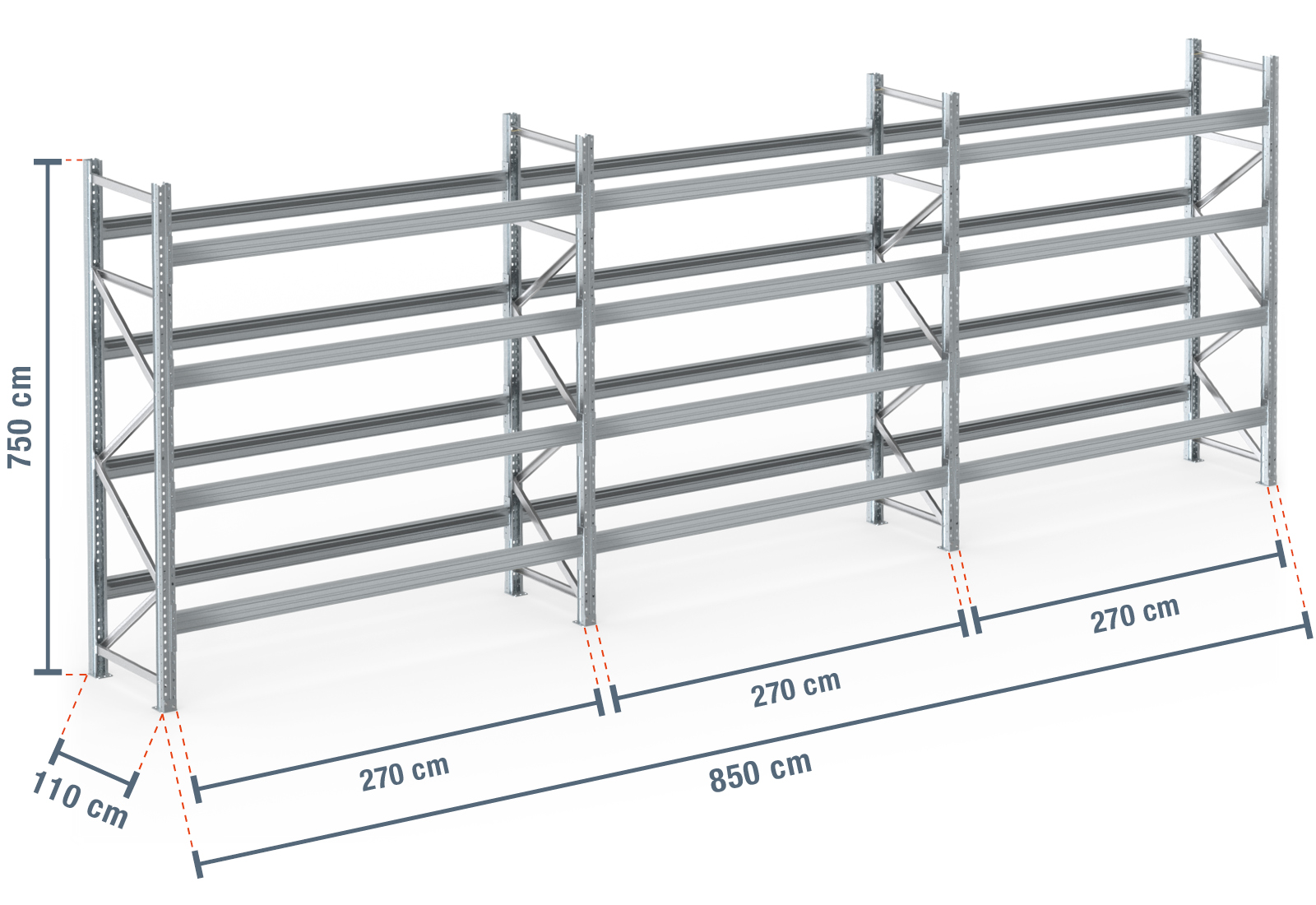 PR9000F estante para paletes 8,5 m galvanizada a quente / 110 cm de profundidade / 7,5 m de altura / 4 níveis para 45 europaletes