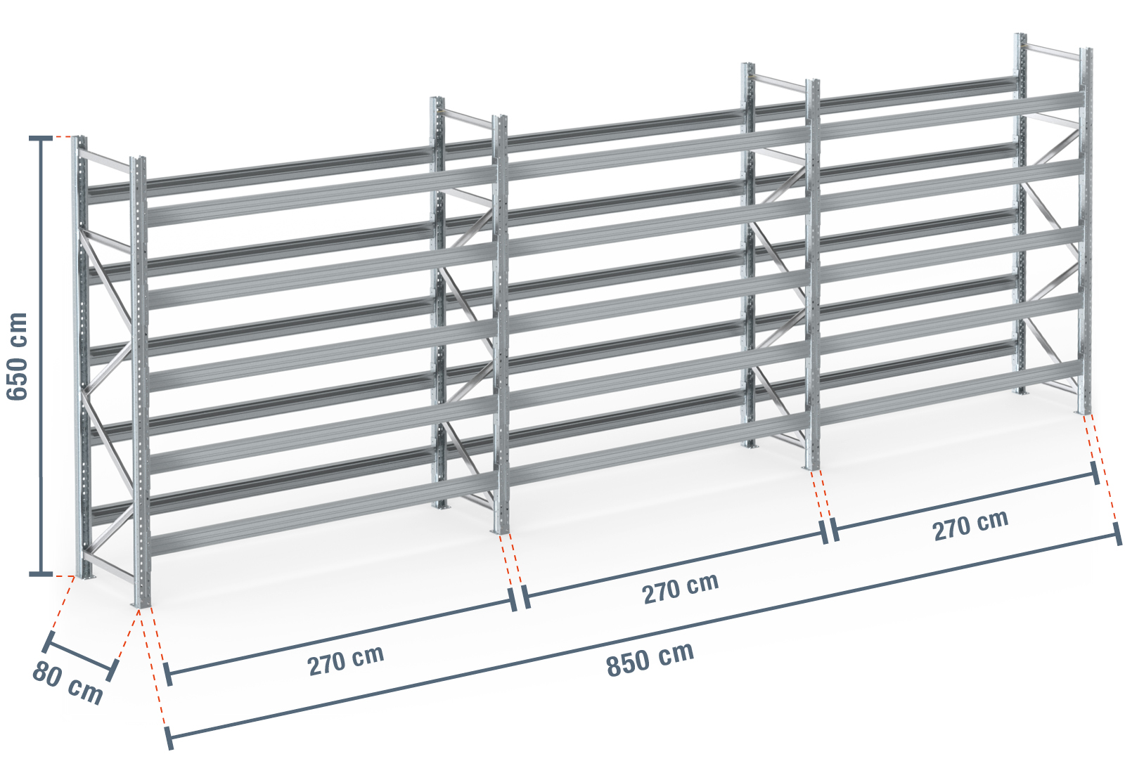 Os montantes são galvanizados, o que os torna aptos para utilização no exterior. Encaixam-se facilmente na estrutura da estante. Cavilhas de segurança adicionais protegem a travessa contra deslocamento acidental e garantem assim a segurança. Os montantes das estantes para paletes são constituídos por dois perfis verticais galvanizados. Os perfis estruturais frontais e traseiros são aparafusados um ao outro com auxílio dos tirantes transversais e diagonais e permitem uma estabilidade particularmente alta. Por segurança, são adicionalmente montadas na estrutura 2 placas de apoio por estrutura da estante na extremidade inferior e fixadas ao solo com âncoras de fixação ao solo. Isto torna a nossa estante para paletes modular não só personalizável, mas também particularmente segura através da fixação à superfície.