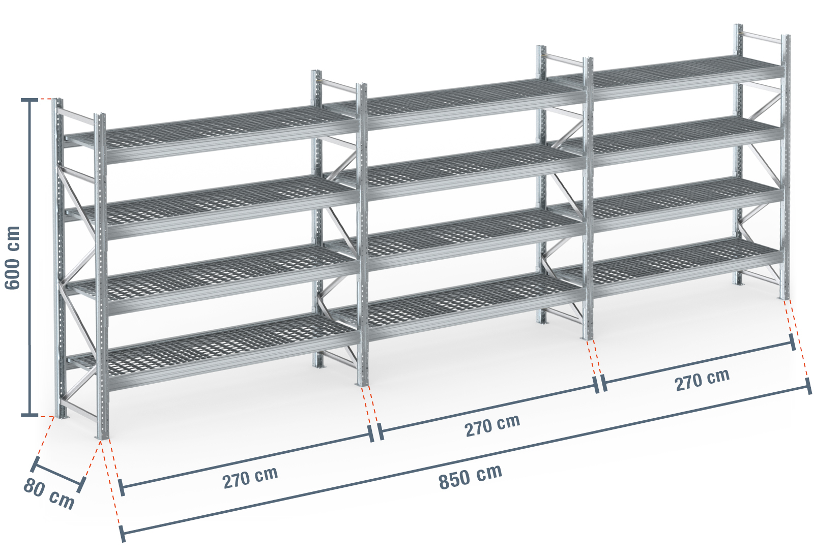 Nós oferecemos as alturas comuns de 200 cm a 750 cm em passos de 50 cm. Para alturas individuais, os montantes da prateleira são cortados à medida a pedido ou fabricados individualmente de acordo com as suas necessidades.