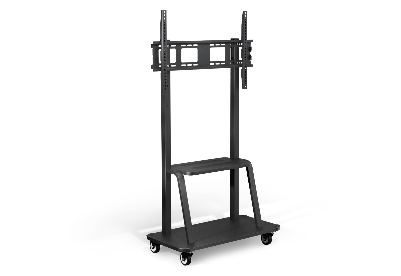 O carrinho rolante flexível para expositores com uma diagonal de ecrã de 52 in - 120 in. O design elegante feito de lacado preto aço, oferece uma superfície de armazenamento prática para utensílios como controlos remotos, consolas, documentos e canetas. A capacidade máxima de carga é 120 kg. Assim, graças ao suporte rolável, é possível mover o ecrã de uma sala para outra com facilidade e rapidez. Com quatro rodízios de borracha, dois dos quais são bloqueáveis, você permanece flexível e móvel!