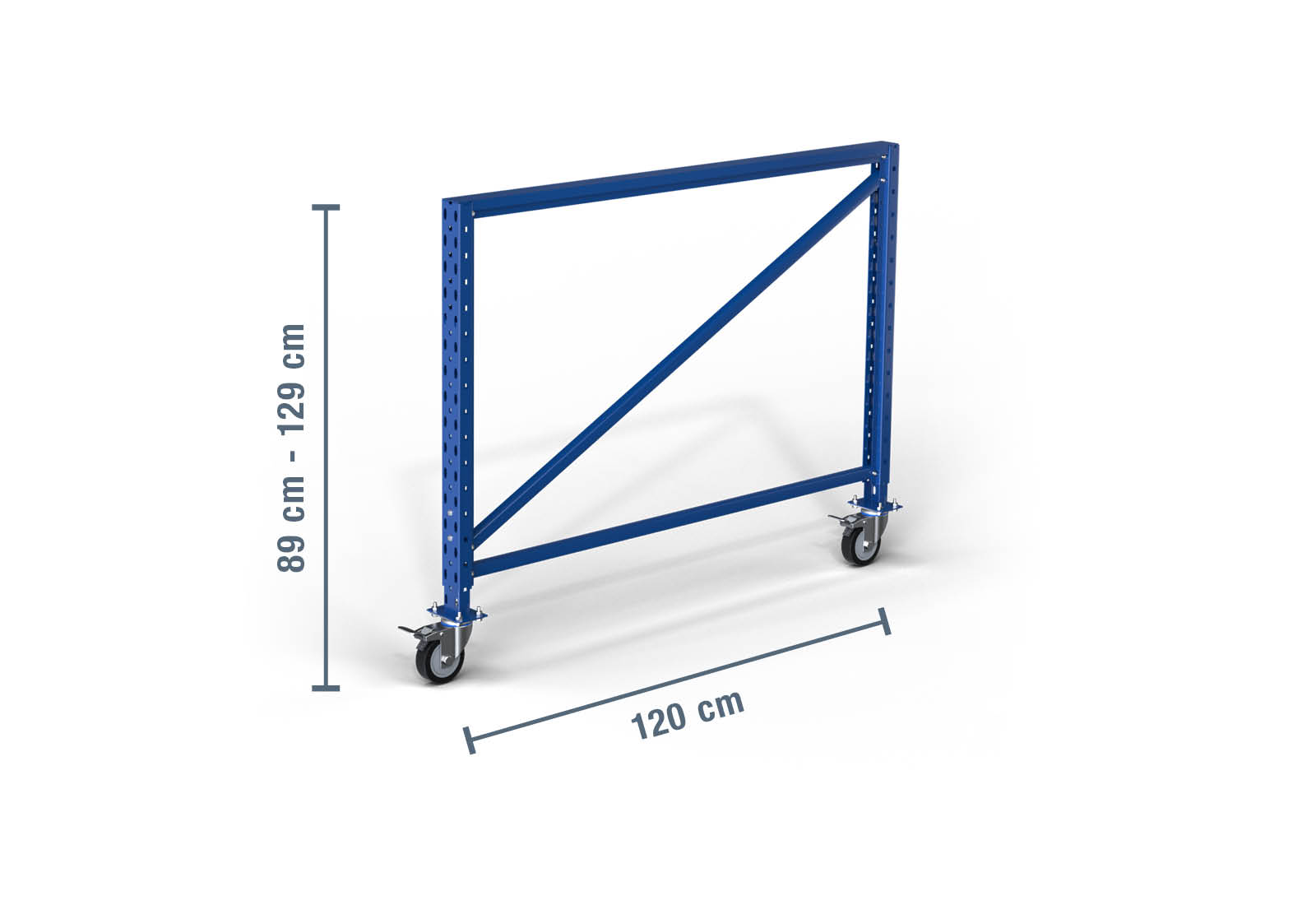 Esta estrutura de estante de armazenamento é especialmente prática graças ao ajuste flexível de altura de 890 - 1.290 mm. Graças às rodas giratórias com travões de bloqueio, a mesa de embalamento pode ser facilmente imobilizada e fixada no local desejado. Isto cria uma estação móvel de embalagem ou de trabalho, com uma profundidade de 1.200 mm. Com esta estrutura móvel de estante de armazenamento, pode expandir a sua estante de armazenamento existente ou montar uma nova individualmente adaptada às suas necessidades.